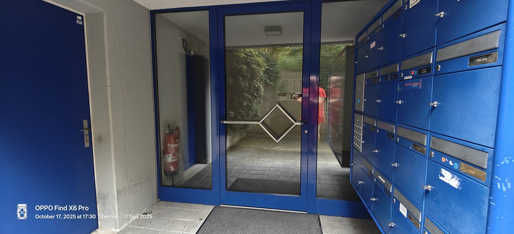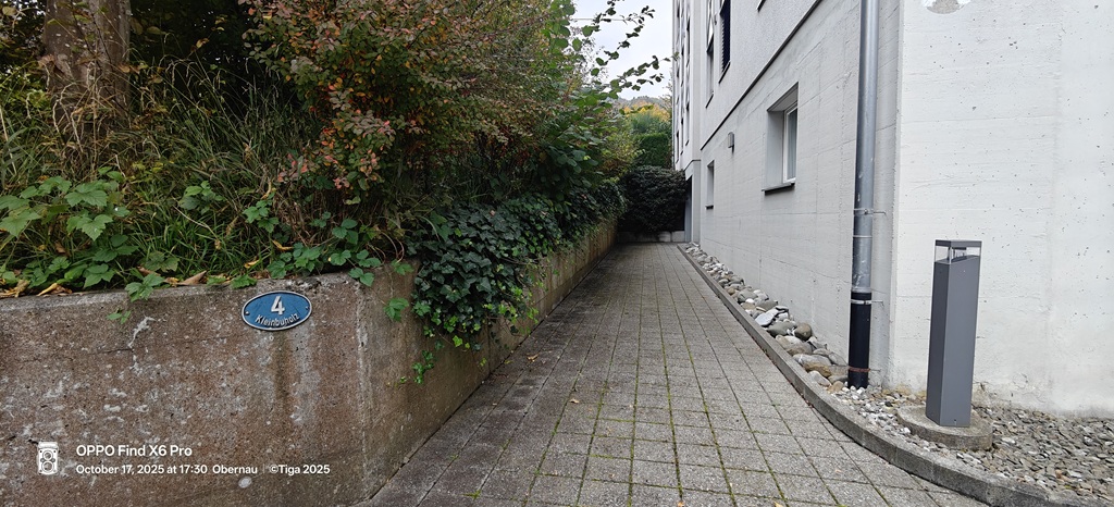 Richtung Quartierladen, links neben der Tiefgarageneinfahrt geht es zum Hauseingang